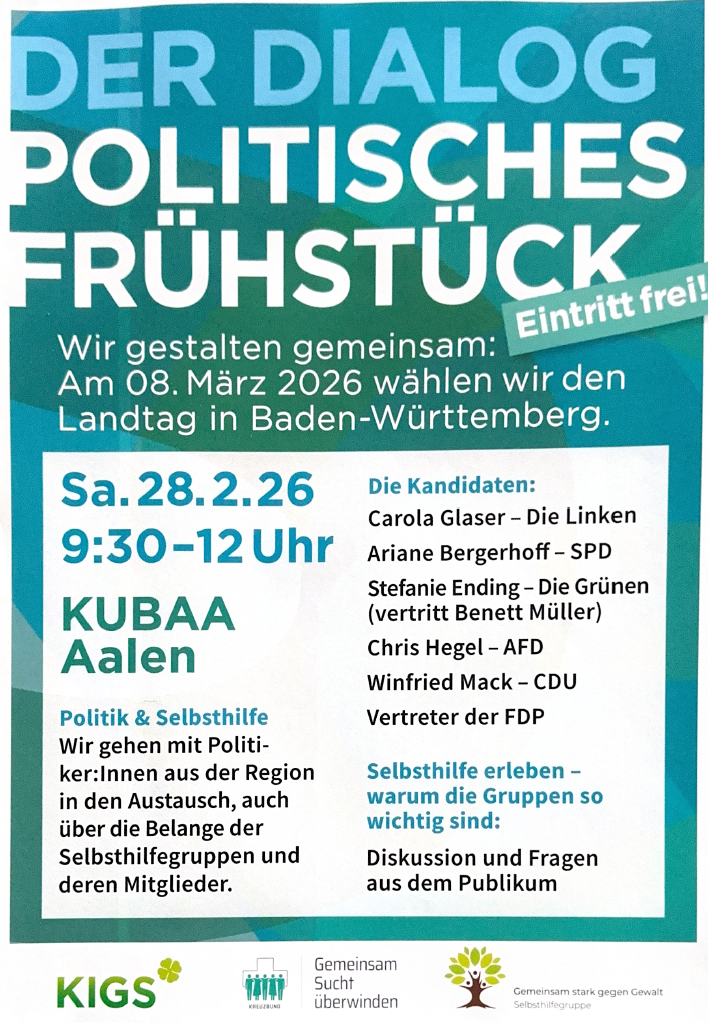 Am Samstag, 28. Februar 2026, laden wir herzlich zum Politischen Frühstück ins KUBAA Aalen ein. Von 9:30 bis 12:00 Uhr treffen Bürgerinnen und Bürger auf Politikerinnen und Politiker aus der Region, um sich im Vorfeld der Landtagswahl in Baden-Württemberg am 08. März 2026 auszutauschen.