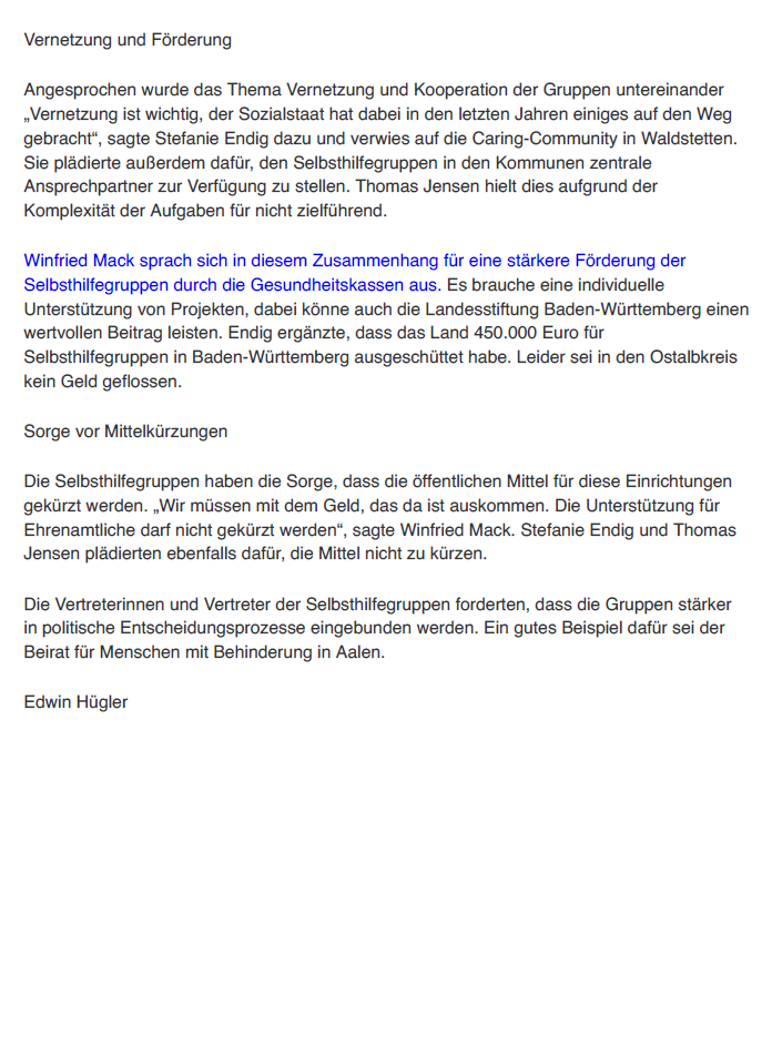Selbsthilfegruppen leisten einen unverzichtbaren Beitrag für unsere Gesellschaft. Sie stärken Menschen in schwierigen Lebenssituationen, fördern Zusammenhalt und geben Betroffenen eine Stimme.